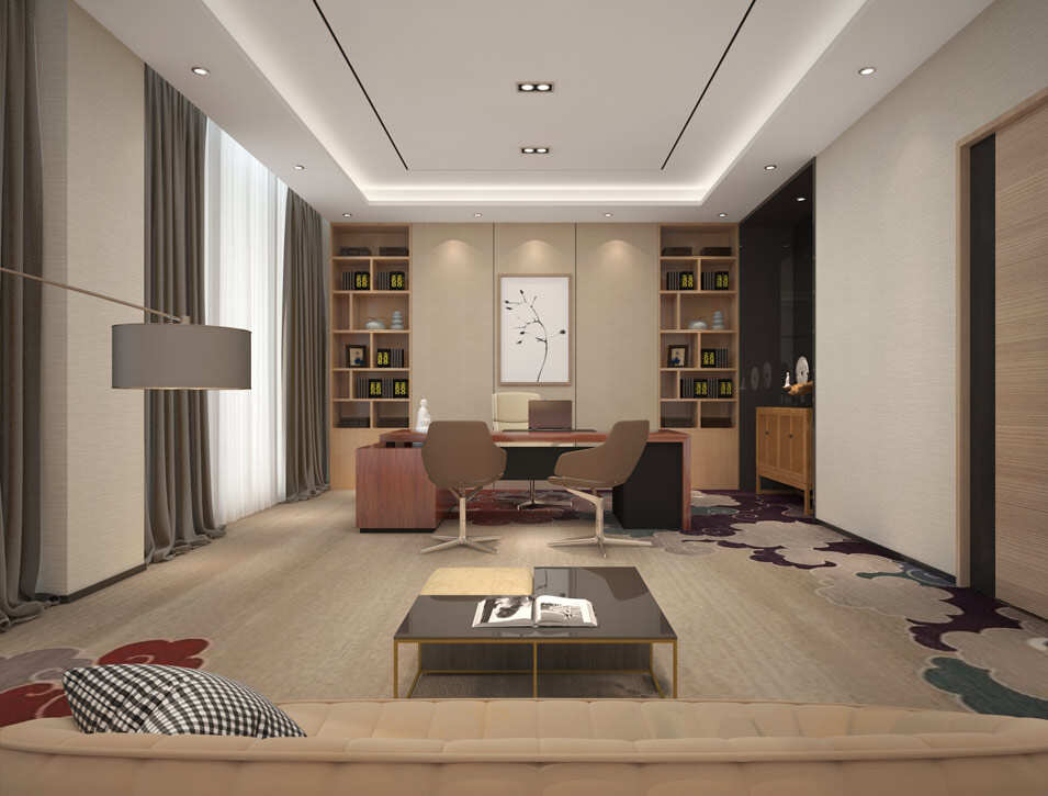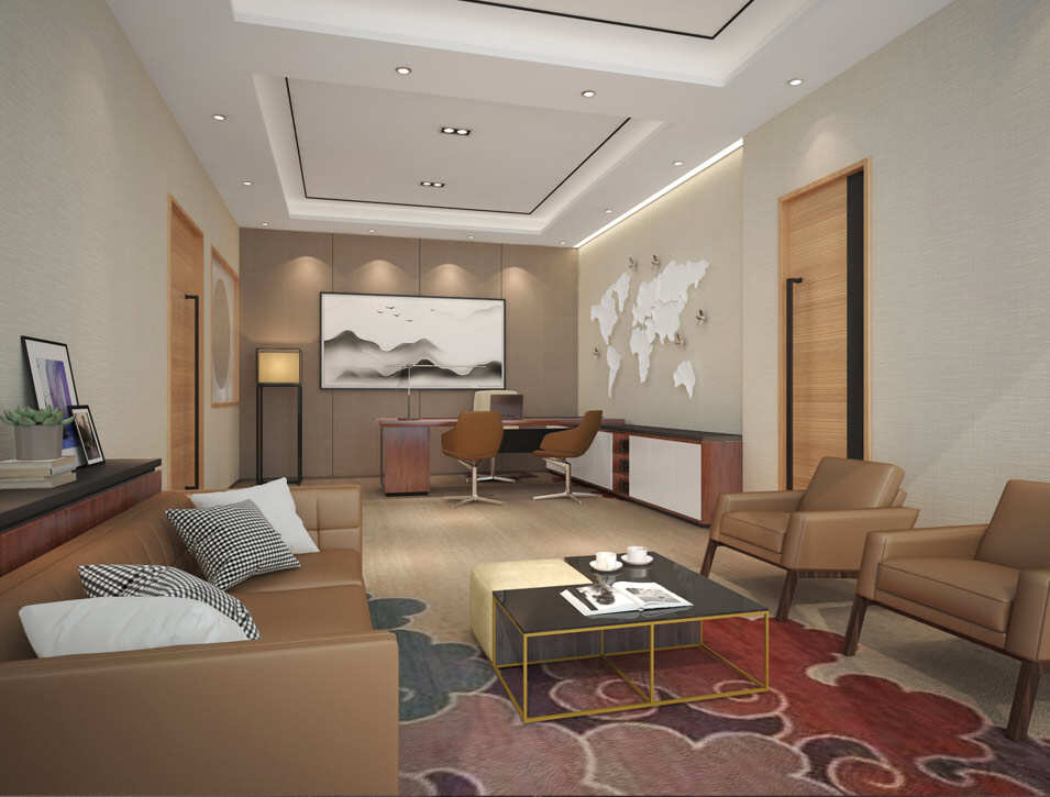 設計介紹:現代辦公室裝修風格,根據公司的產品特點,選用白色,棕黃色為主,前臺原生態(tài)的木樁凳子、木色前臺桌,紋理的地板搭配不一樣的風格,會議室注重采光,頂部明亮的燈,通透的玻璃可以光引到空間里,領導辦公室墻壁上掛著寫意畫十分有藝術感,棕色的皮質從色彩效果來講,棕色也是百搭的不二之選,為領導的空間帶來一定品質感。